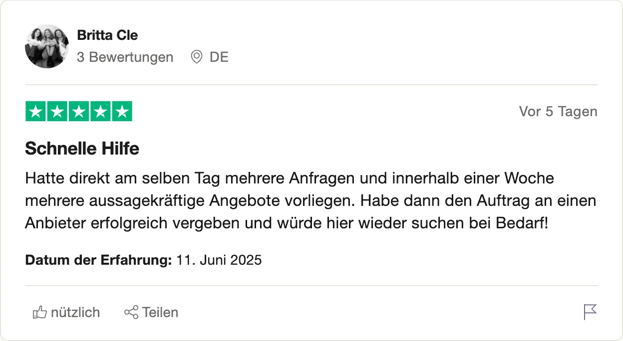 Beantworten Sie uns einige Fragen zum Umfang und Art Ihrer gesuchten Dienstleistungen, damit Sie konkrete Angebote erhalten.